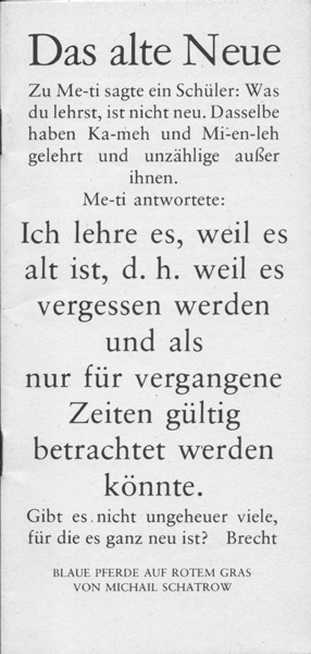 Das Programmheft, das zu jeder neuen Inszenierung herausgegeben wurde, verlangte dem Dramaturgen und dem Grafiker den Einsatz ihres ganzen Könnens, ihrer Energie, ihrer Sorgfalt und Nervenkraft ab. Dem Dramaturgen oblag es, Texte zu redigieren, die einerseits über die sozialpolitischen Aspekte und Hintergründe der Zeit informierten, in der das Stück entstand, aber auch über die Rezeption des Theaterwerks in den verschiedenen Epochen und nicht zuletzt über die dramaturgischen Schwerpunkte der aktuellen Inszenierung. Der Grafiker setzte das "Material" in eine grafische Form um, die einem hohen ästhetischen Niveau entsprechen musste. Das setzte besondere dramaturgische und gestalterische sowie typografische Kenntnisse voraus, in Hinblick auf das ungewöhnliche Format, das auch eine besondere buchbinderische Verarbeitung verlangte.